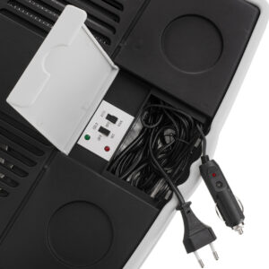 - Комплект містить кабелі для підключення холодильника до розетки прикурювача постійного струму 12 В в автомобілі та до розетки змінного струму 230 В.
