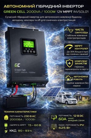 Автономний гібридний інвертор GREEN CELL 2000VA 1000W 12V MPPT INVSOL01