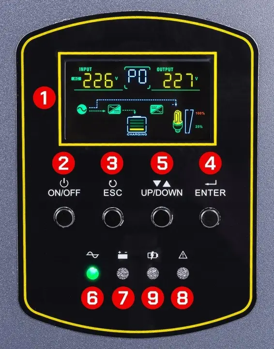 РК-дисплей дозволяє користувачам контролювати ключові параметри джерела живлення, такі як вхідна та вихідна напруга, частота в Гц, стан батареї, навантаження та поточний режим роботи. Це забезпечує постійну видимість стану пристрою та дозволяє швидко реагувати за потреби.
