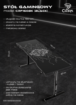 Опис товару: Стіл Cobra XL-MATE CRF160 Czarny Стіл Cobra XL-MATE CRF160 Czarny – це стильний та функціональний стіл для вашого офісу або домашнього робочого простору. Завдяки своєму елегантному дизайну та високій якості матеріалів, цей стіл стане незамінним елементом вашого інтерʼєру. Основні характеристики: Підсвічування: відсутнє Регулювання висоти: відсутнє Ширина стільниці: 160 см Колір стільниці/каркасу: чорний / чорний Переваги: Стильний чорний колір, який вписується в будь-який інтер’єр Широка стільниця для комфортної роботи Міцний і стійкий каркас Ідеальний вибір для: Стіл Cobra XL-MATE CRF160 Czarny ідеально підходить для професіоналів, які цінують стиль та функціональність. Це чудовий вибір як для офісів, так і для домашніх кабінетів. Обирайте Стіл Cobra XL-MATE CRF160 Czarny і насолоджуйтесь комфортом і зручністю роботи за цим високоякісним столом!