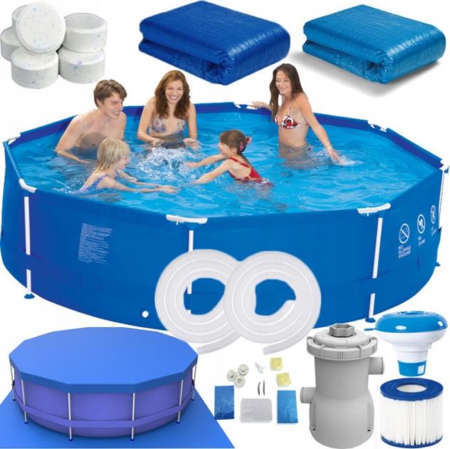 Садовий басейн на міцному каркасі. Оригінально упакований в міцну кольорову картонну коробку. Матеріал 3-х шаровий ПВХ! Висока якість продукції. У наборі аж 19 елементів: насос, дозатор хімії та багато іншого!