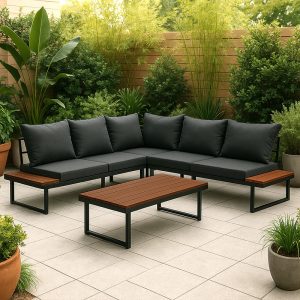 Садовий комплект TOBA-BL-WD1 від Velaco – це елегантна та продумана пропозиція для людей, які цінують сучасний дизайн, комфорт та довговічність. Симетричне кутове розташування, що базується на двох паралельних диванах, з’єднаних кутовим модулем, забезпечує комфортний простір для відпочинку 5 осіб.