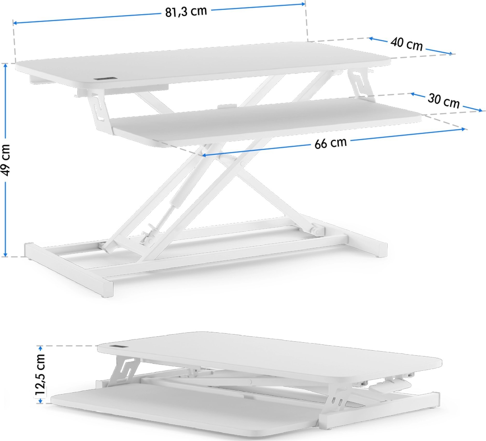 Ми пропонуємо вам пристрій із двома робочими платформами: більшою та меншою. Перша призначена для більших пристроїв, таких як два 24-дюймові монітори або монітор і ноутбук. Тут достатньо місця, а робоча поверхня має розміри 81,3 x 40 см. Нижній рівень менший, його розміри 66 x 30 см, і він ідеально підходить для клавіатури та миші, а також важливих документів, які завжди будуть під рукою.
