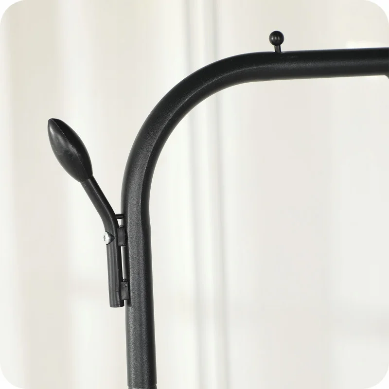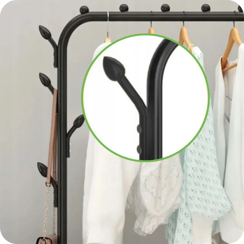 Додаткові гачки збоку вішалки дозволяють зручно вішати аксесуари, такі як сумочки, парасольки, капелюхи, краватки або рюкзаки. Завдяки продуманому розташуванню та міцній конструкції, вони також можуть легко вміщувати важчі предмети без ризику зім’яти одяг.