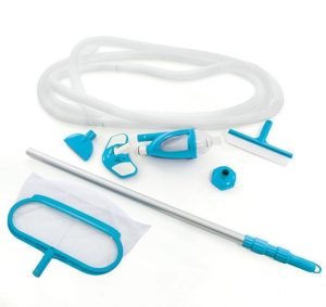 Intex 28003 це універсальний комплект для чищення каркасного, надувного і навіть стаціонарного басейну. Всі складові набору виготовлені з високоякісних і міцних матеріалів. В комплект поставки входить дрібно пористий сачок, для збору різного сміття з поверхні води, а також жорстко-ворсиста щітка для чищення дна та стінок басейну, різні насадки для пилососа. Величезним плюсом даного комплекту для чищення басейнів є те, що він працює за принципом пилососа, тобто підключається безпосередньо до насоса-фільтра для очищення та рециркуляції води в басейні, таким чином можна починати процес збирання. Для повністю ефективної роботи пилососа компанія Інтекс радить використовувати насос-фільтр, продуктивністю від 3028 літрів на годину. До ручки, довжиною 279 сантиметрів, прикріплюється гофрований шланг, який забезпечить доступ до будь-якої точки басейну діаметром не більше 549 сантиметрів.Для роботи вакуумної насадки і пристрої для очищення поверхні потрібно фільтруючий насос з продуктивністю від 5678 л/ч.