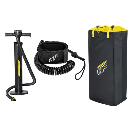 Дошка дуже проста у використанні; просто надуйте її за допомогою ручного насоса, що входить до комплекту, і все готово. Еластичні шнури ідеально підходять для перенесення таких предметів, як ласти або маска. Завдяки дуже високій плавучості вона може легко витримати людину вагою до 130 кг (включно з багажем).