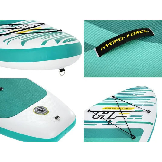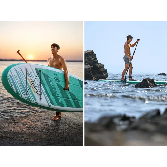 Виготовлена з матеріалу Tritech — спеціального тришарового ламінату з поліефірною сіткою та ПВХ-серцевинею для жорсткості та довговічності — та Drop Stitch — надувної конструкції, яка гарантує стійкість на воді. Ця надувна дошка є невід’ємною частиною будь-якого спорядження для тих, хто любить тривалі водні екскурсії.