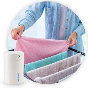 - Скорочує час висихання одягу – осушувач інтенсивно осушує повітря, прискорюючи природний процес випаровування вологи з білизни.