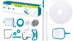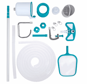 - ПОВНИЙ КОМПЛЕКТ – очищувач поверхні, пилосос для басейну, сітка та регульована штанга.