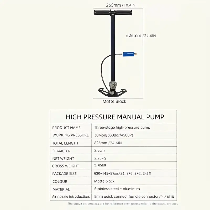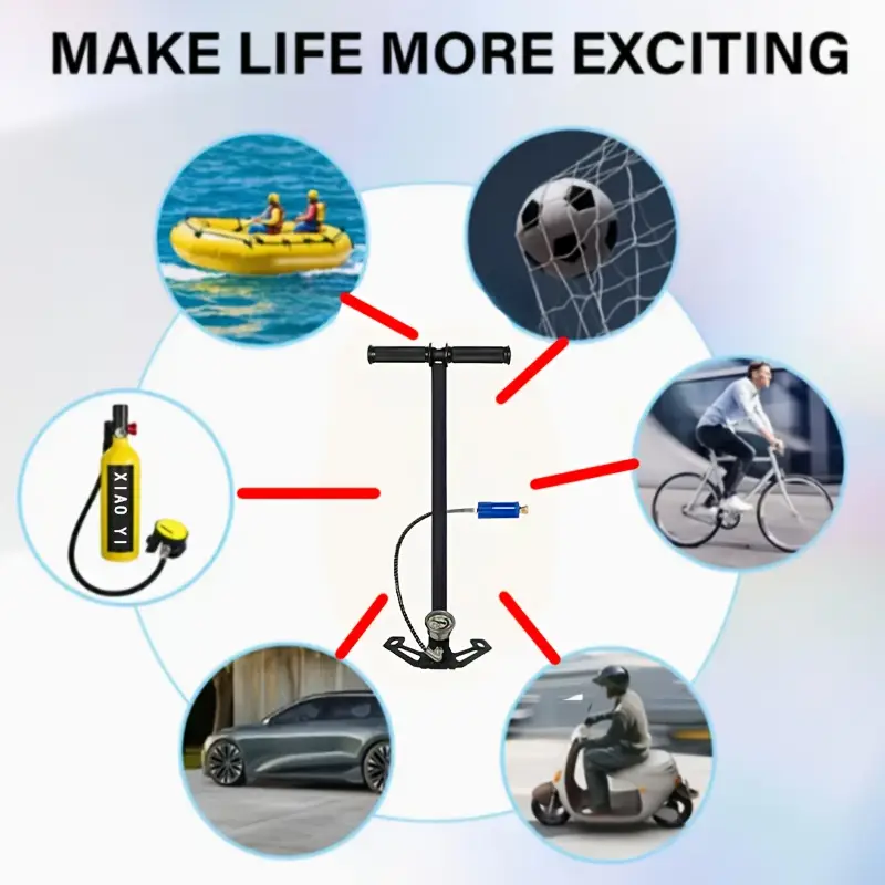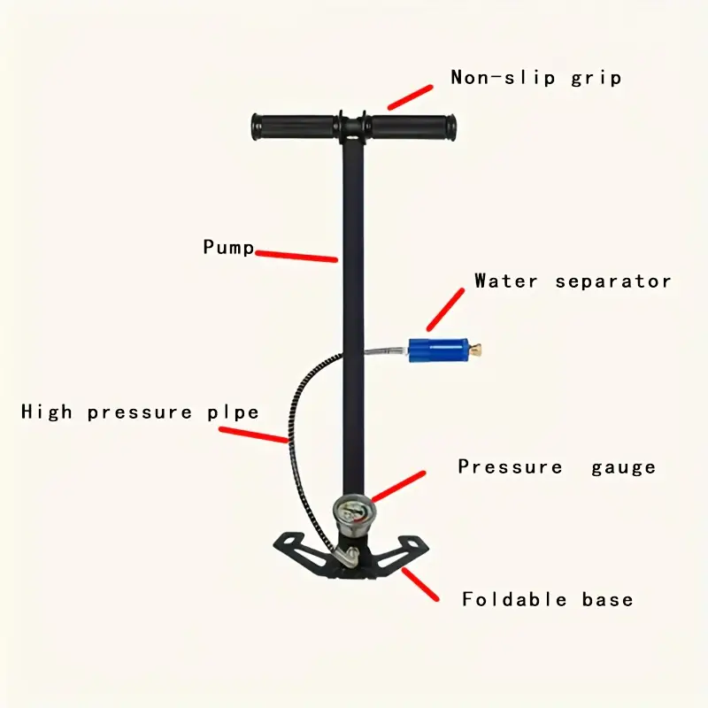- Насос високого тиску, ручного типу, призначений для заправки балонів, камер PCP, або інших пристроїв, які вимагають великого тиску повітря (до ~30 МПа, тобто приблизно 300 атмосфер).