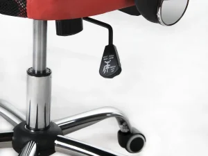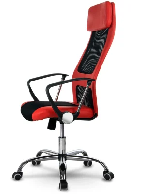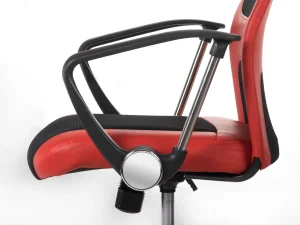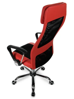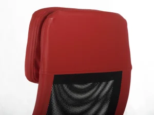 Для максимального комфорту використання та посилення візуальних акцентів оббивка крісла покрита комбінацією сітчастої тканини та екошкіри модного червоного кольору. Товсте і широке сидіння в поєднанні з м’яким підголівником додатково підвищує зручність використання і функціональність цього предмета меблів.
