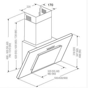 - Дана похила витяжка кріпиться до стіни над варильною поверхнею і може працювати у двох режимах – відведення повітря (при підключенні до системи вентиляції) та рециркуляції (при використанні змінного вугільного фільтру).