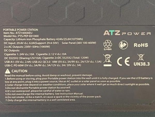 ТЕХНІЧНІ ХАРАКТЕРИСТИКИ ATZPower ATZ1000AEU LiFePO4: